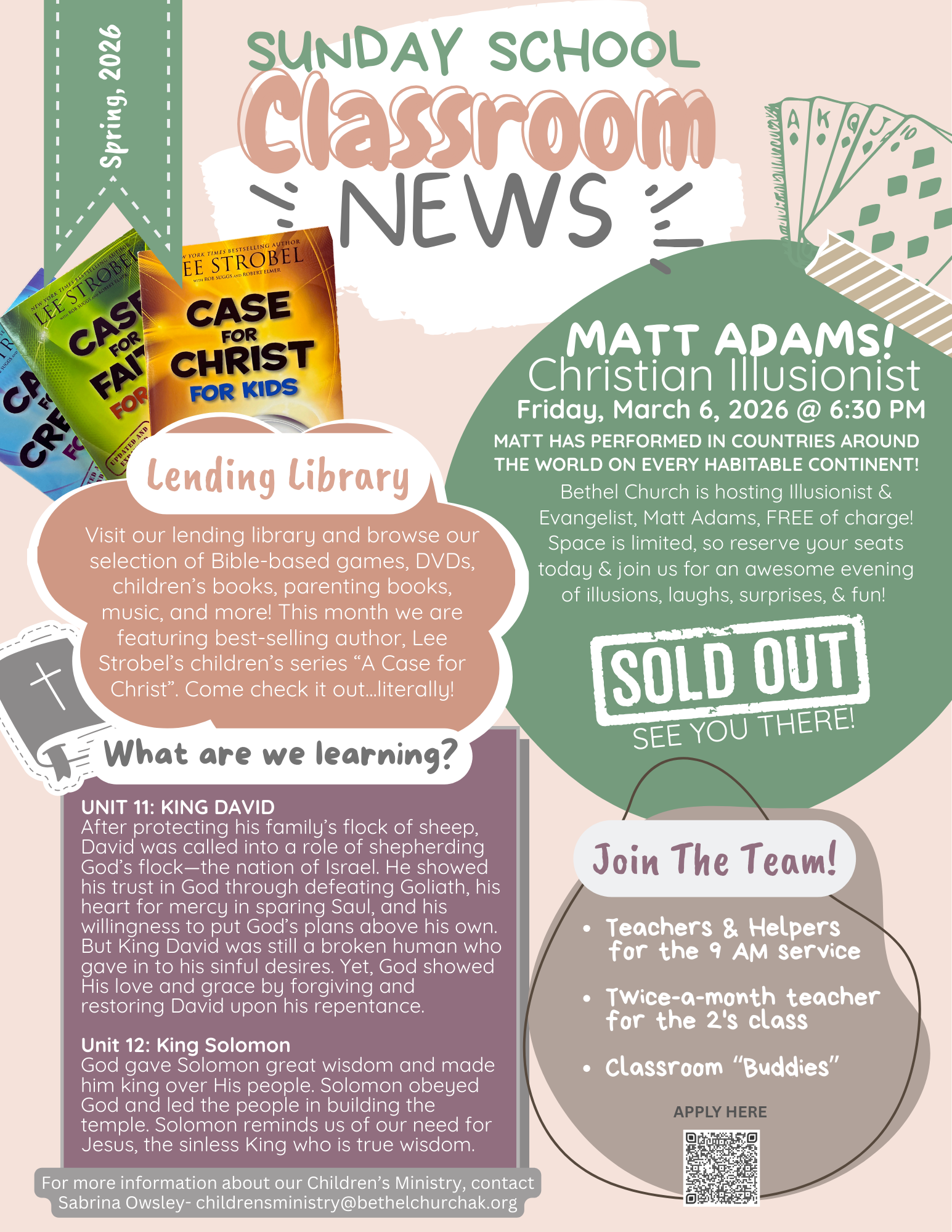 In Sunday School, kids ages 2-6th Grade are using The Gospel Project curriculum. This curriculum goes through the entire Bible from Genesis to Revelation, and the kids hear how the lessons point to the Gospel each week!